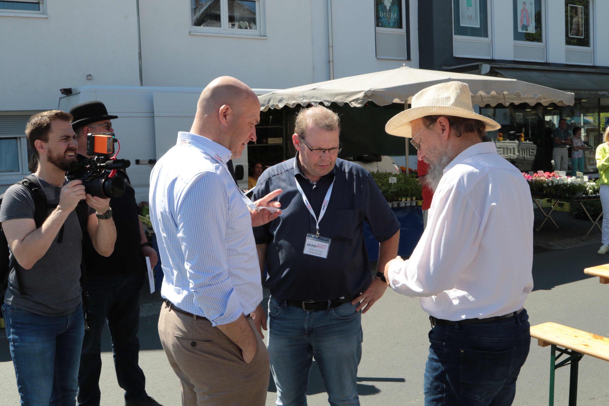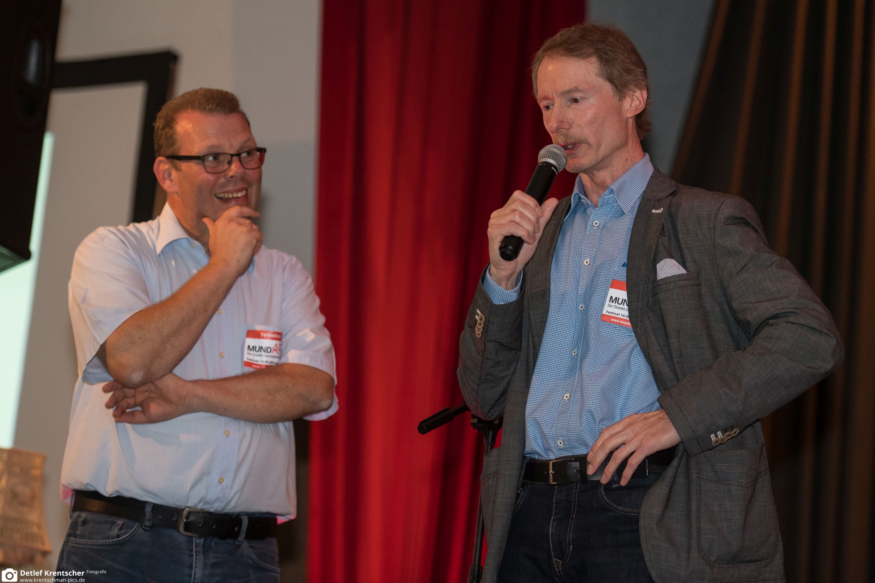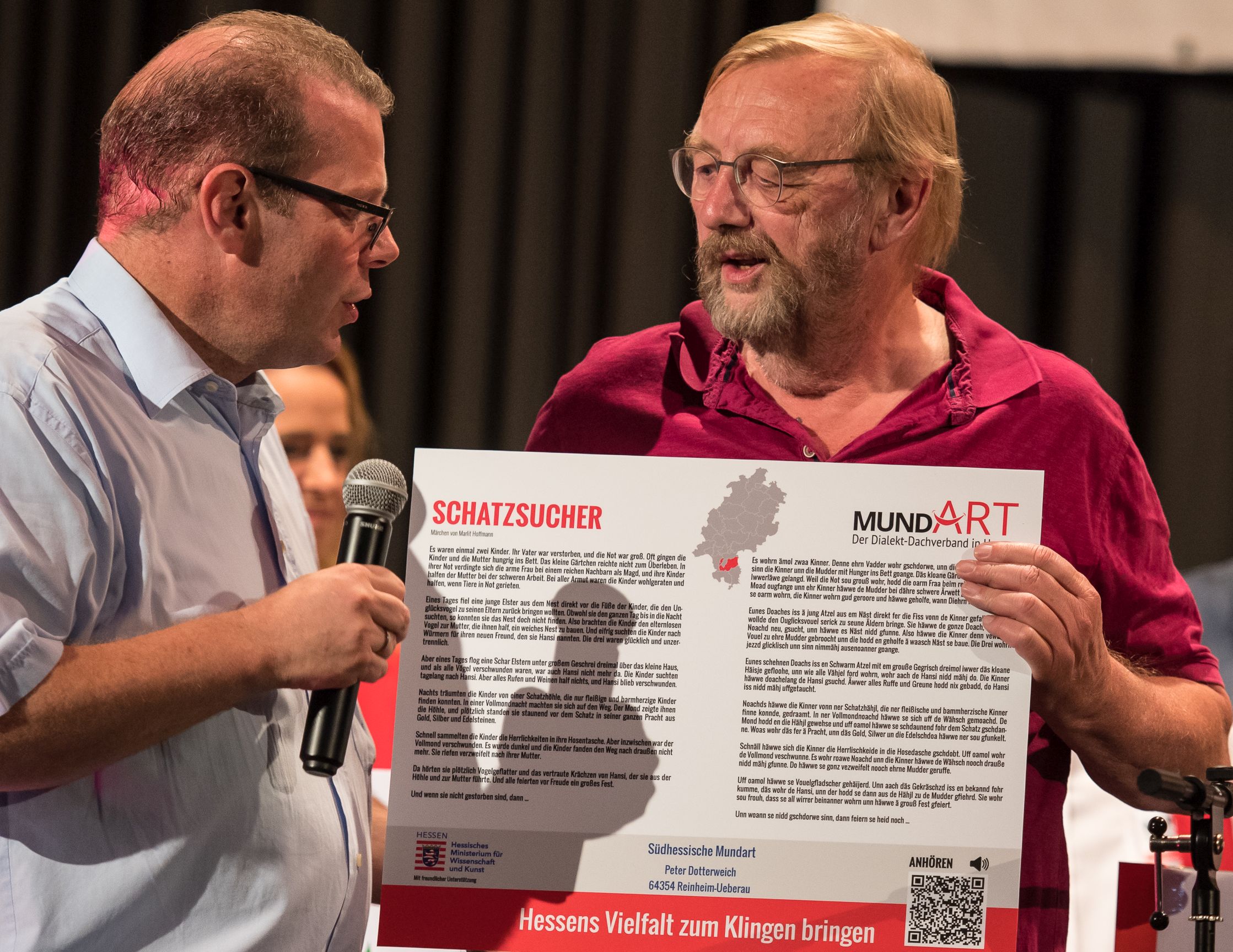- Schatzsucher: Götz Konrad überreicht Pit Dotterweich sein Mundart-Plakat.