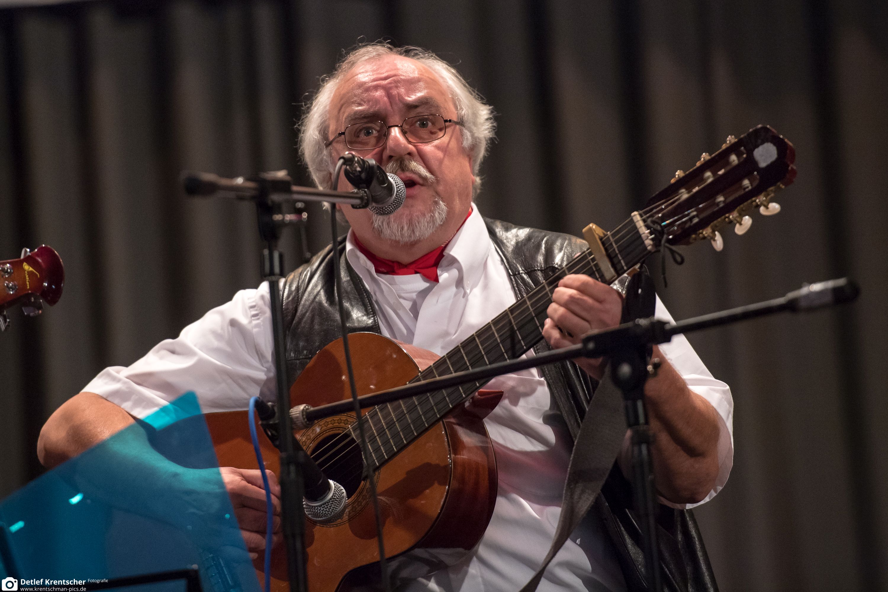 „onnerweschs – unterwegs – chemin faisant” Der Folksänger, Liedermacher Manfred Pohlmann ist ein heimatverliebte Weltbürger. Er spielt seit 53 Jahren öffentlich und kann dabei auf mehr als dreitausend Auftritte zurückblicken. Auch international ist er unterwegs. Pohlmann ist einer der Väter der moselfränkischen Liederszene. Moselfränkisch ist eine Mundart, eine Sprooch, die zwischen dem Siegerland und dem Westerwald und Luxemburg, Lothringen, Südbelgien und dem Saarland gesprochen wird. Auch am mittleren Mittelrhein, rund um Koblenz, wo Pohlmann zuhause ist. Zunächst war er mit seiner Gruppe “Edelzwicker” onnerweschs. Später mit seiner deutsch-französischen Band “Mannijo” – oder wie heute und hier: Solo. Er hat in die Welt des Theaters und des Kabaretts hinein geschnuppert, als Produzent gearbeitet und 47 Tonträger veröffentlicht. Mit seinem elsässischen Kollegen Roger Siffer begann seine erfolgreiche Arbeit in Frankreich. Mit welchem seiner Programme er auch auftritt – auf der Bühne versteht er sich als „Unterhalter“, der mit heiterer Ernsthaftigkeit seinem Publikum gute Gefühle und Kurzweile schenkt.