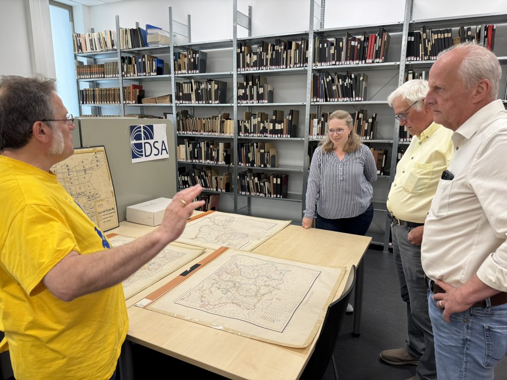 Wörterschatz: Dr. Brigitte Ganswindt zeigt dem Vorstand des neugegründeten Freundeskreises bei seiner ersten Sitzung das Archiv des Forschungszentrums Deutscher Sprachatlas. Vorsitzender Andreas Stahl (links) und sein Stellvertreter Bernd Schmidt (r.) sind beeindruckt und begeistert. (Foto: Götz D. Konrad)