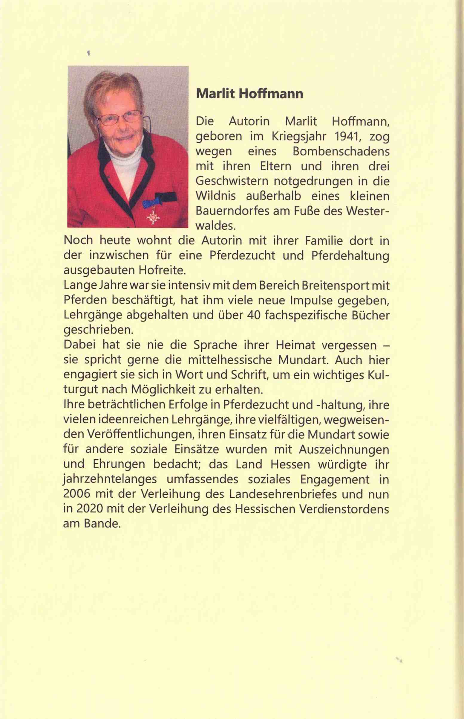 „Geschichtcher frei voo de Lewwer“ hat Marlit Hoffmann (13.05.1941-16.10.2022) in drei kleinen Bände veröffentlicht in den Corona-Jahren 2020-2021. Ihr Mann Karl half, als die Kräfte schwanden, diese Triologie zu vollenden. Kurze Geschichten wie diese sind typisch für Marlit. Sie wollte sich und andere erinnern und damit aber auch immer wieder zeigen, dass man voneinander und miteinander lernen kann. Die Gegenüberstellung von Mundart und Hochdeutsch gab übrigens auch die Grundlage zu unserem Schatzsucher-Projekt.
